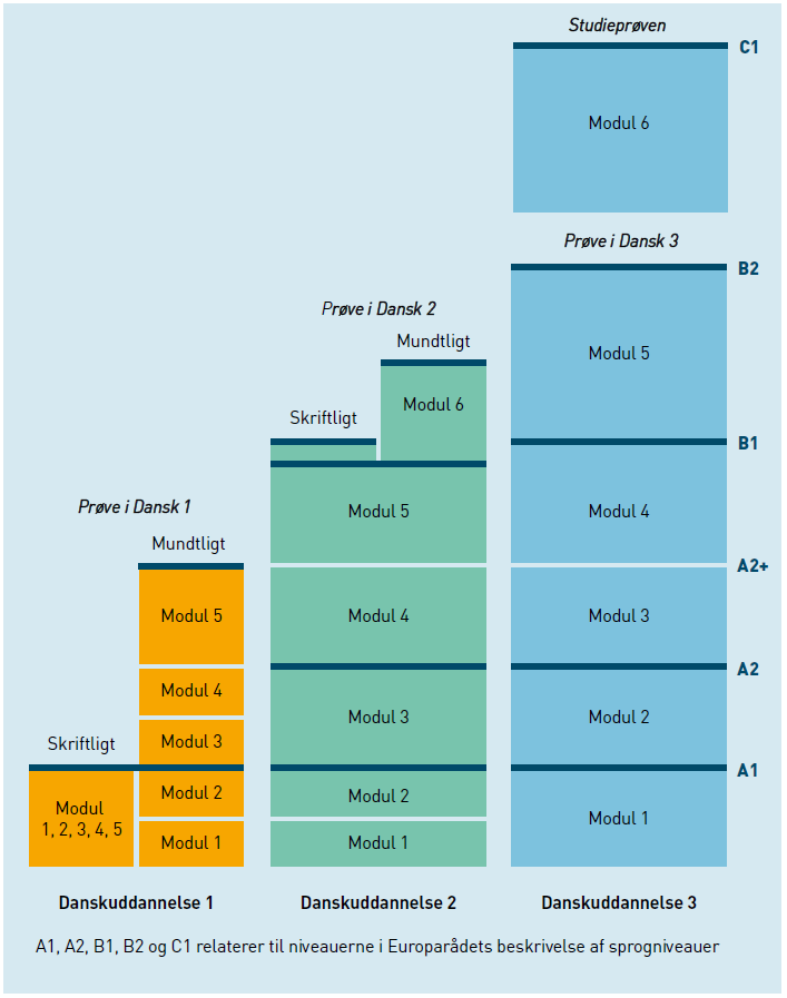 Danskuddannelsen er inddelt i tre selvstændige uddannelser, tilrettelagt efter kursisternes uddannelsesbaggrund og behov. Det betyder, at du kun skal gå på én Danskuddannelse. Du skal ikke gennemføre dem alle tre efter hinanden. Det er vores visitator, der vurderer, hvilken uddannelse der passer til dig. Du kan ikke selv vælge, hvilken Danskuddannelse, du vil tage.